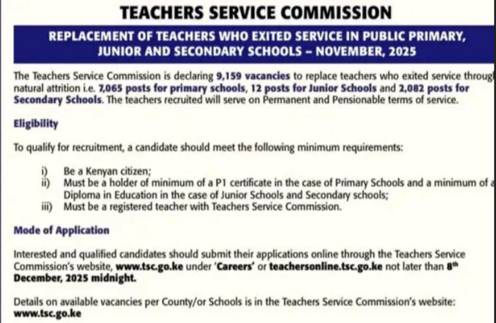 The Teachers Service Commission is declaring 9,159 vacancies to replace teachers who exited service through natural attrition i.e. 7,065 posts for primary schools, 12 posts for junior schools and 2,082 posts for secondary schools.