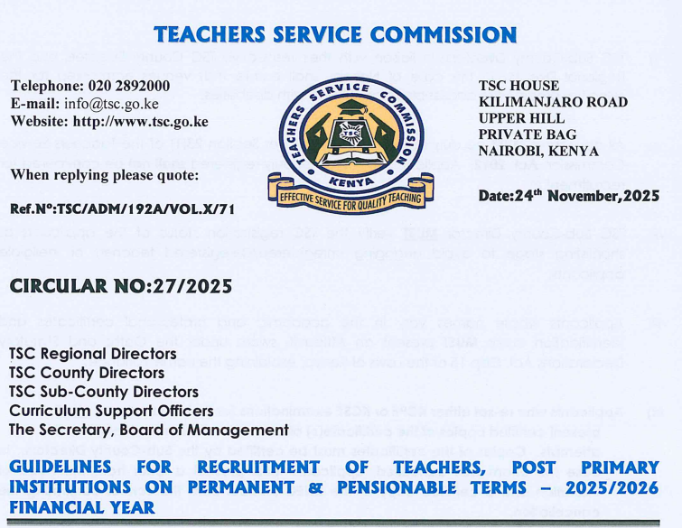 GUIDELINES FOR RECRUITMENT OF TEACHERS, POST PRIMARY INSTITUTIONS ON PERMANENT PENSIONABLE TERMS – 2025/2026 FINANCIAL YEAR